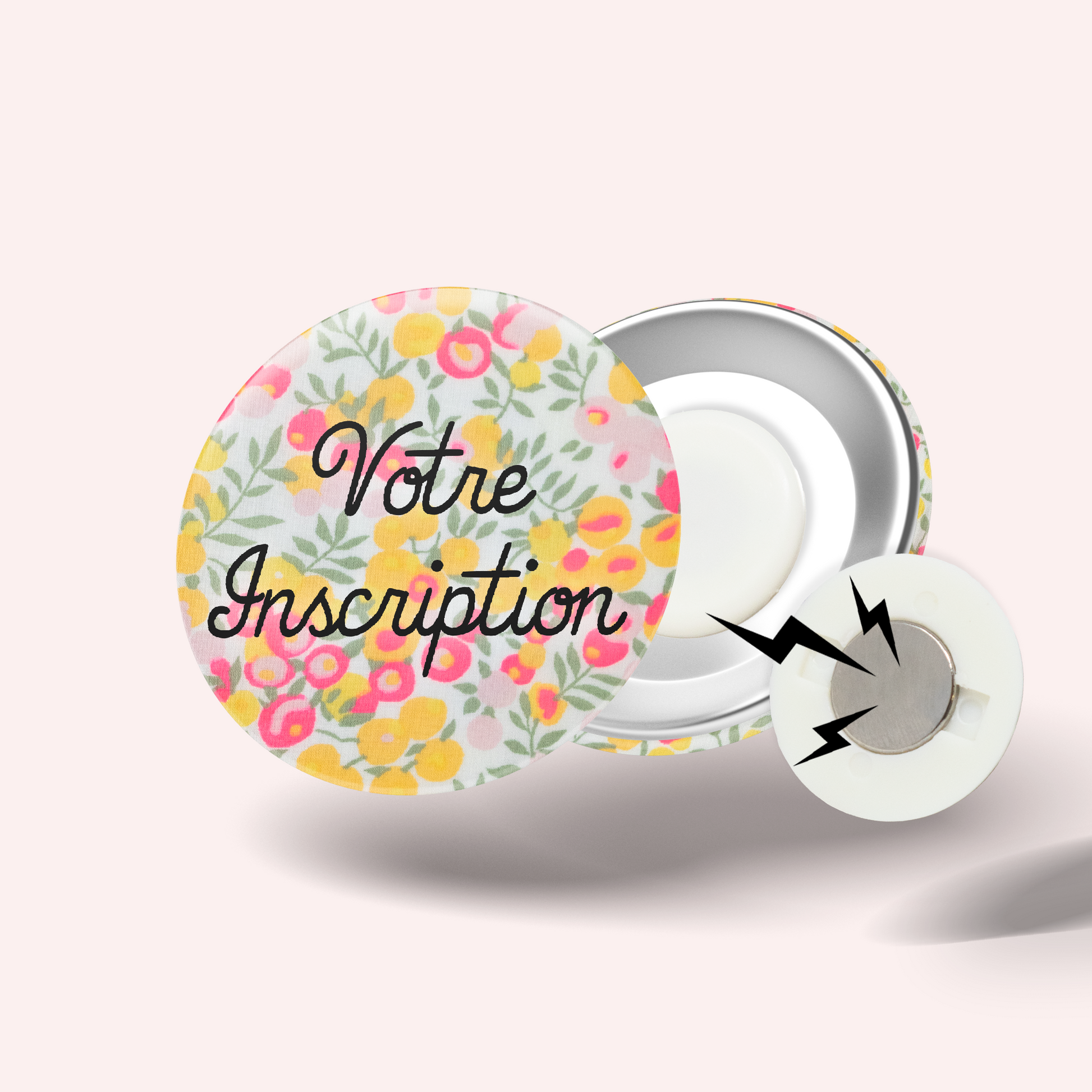 Choose between two options: a classic pin model or a magnetic version that attaches easily without damaging clothing, thanks to a magnet that slips discreetly behind the fabric.