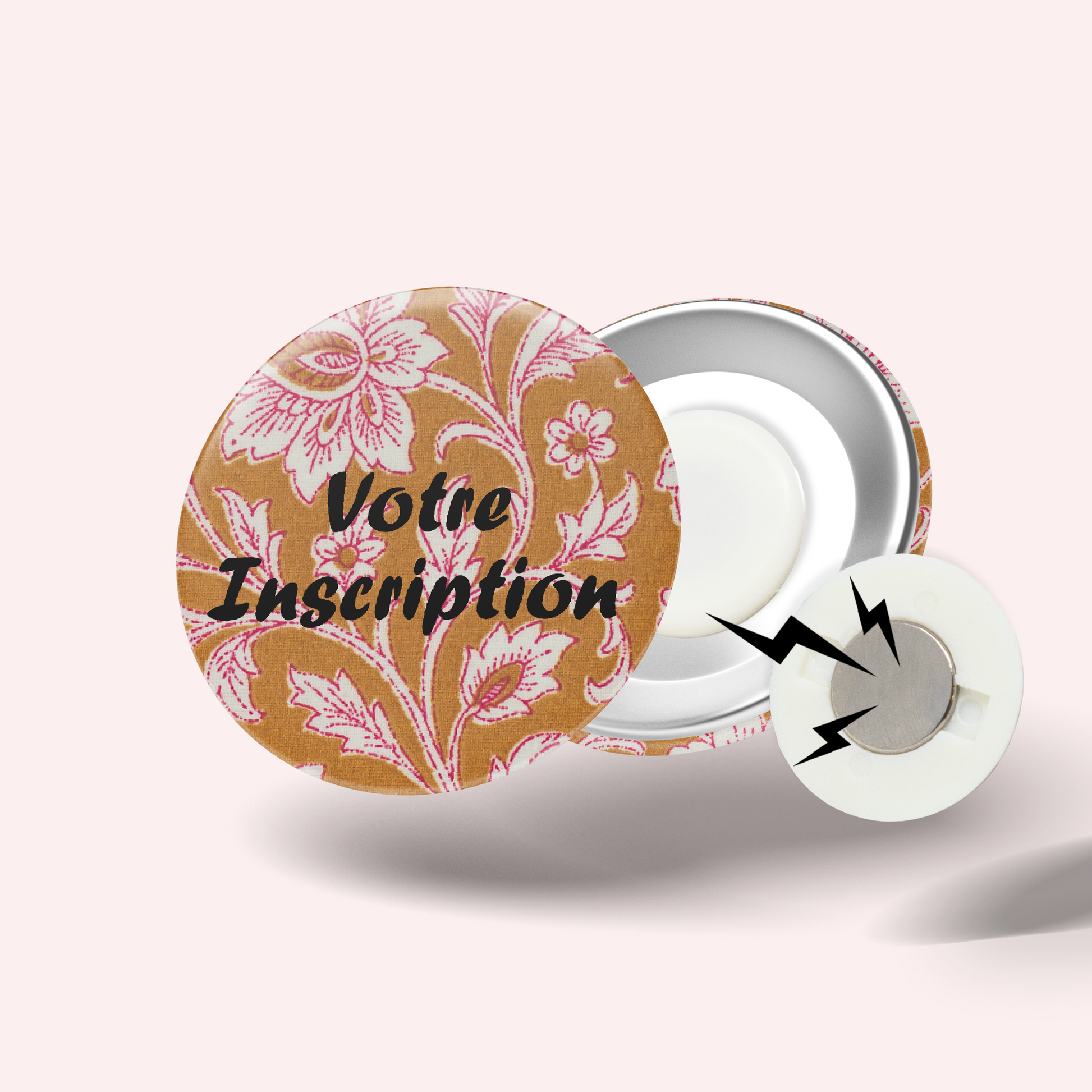 Choisissez entre deux options : un modèle à épingle classique ou une version aimantée qui se fixe facilement sans abîmer les vêtements, grâce à un aimant qui se glisse discrètement derrière le tissu.